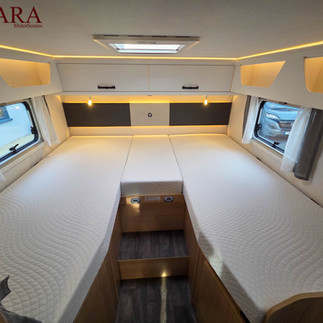 Inside, the cleverly designed layout features lowered twin rear beds for easy accessibility, offering both comfort and convenience without the need for steep steps.