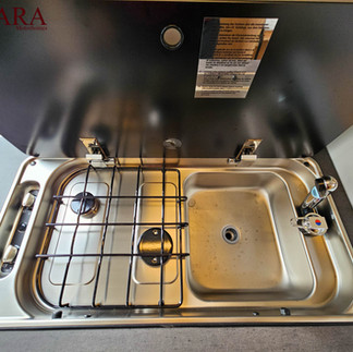 The motorhome boasts a well-equipped kitchen area with a 3-ring hob and oven, perfect for preparing meals on the go.